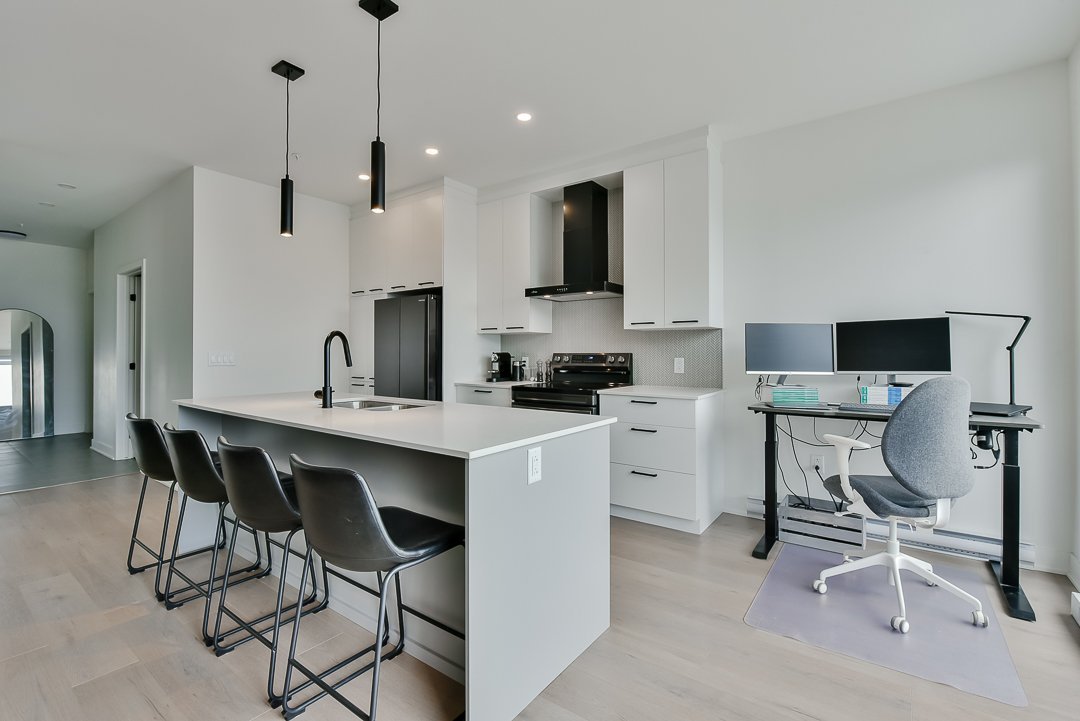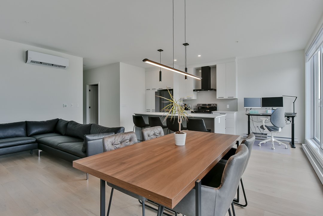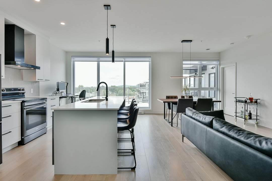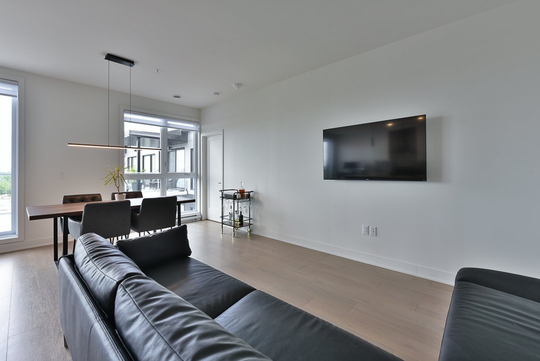This corner unit, nestled on the top floor, offers unmatched privacy and exceptional panoramic views of Montreal, fireworks, and the majestic Mount Saint-Bruno. With indoor parking that includes storage space and a Tesla charger, this home combines convenience and luxury. The new home warranty is still in effect, ensuring continuous peace of mind.