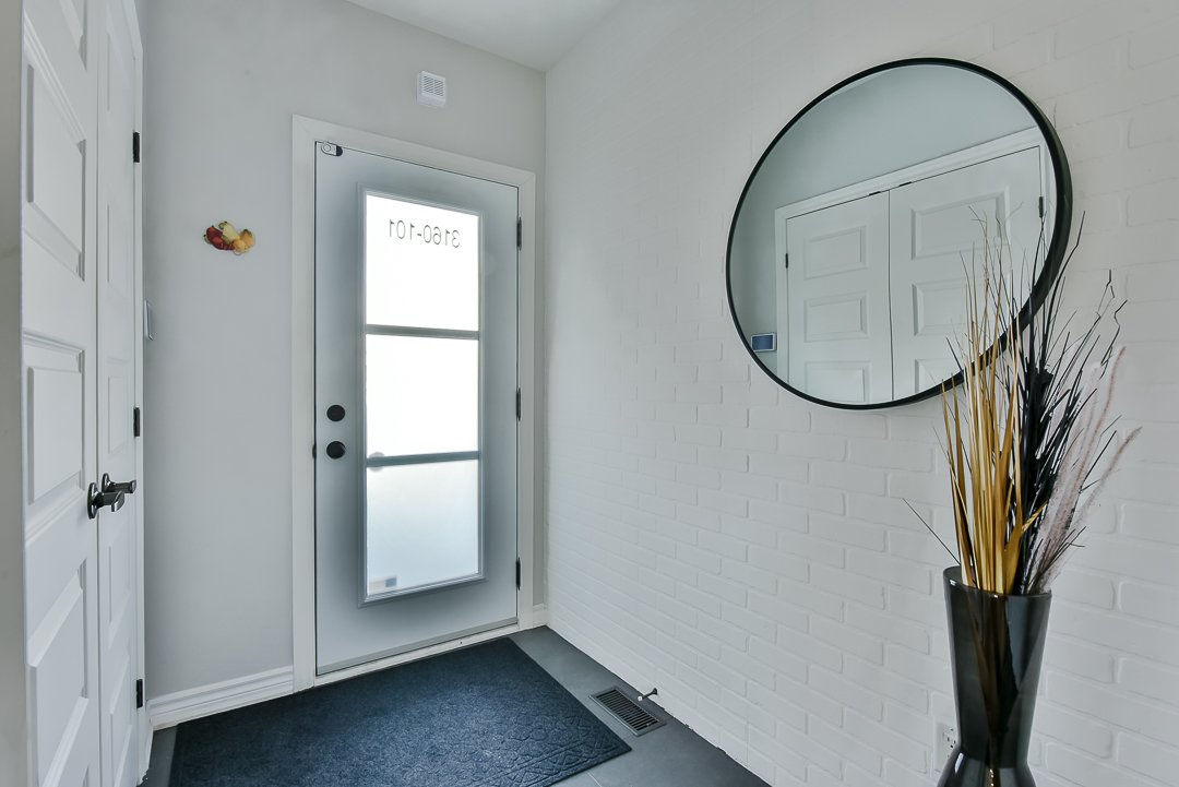 Upon entering, the foyer is distinguished by an elegant white brick wall, creating a warm and inviting atmosphere.